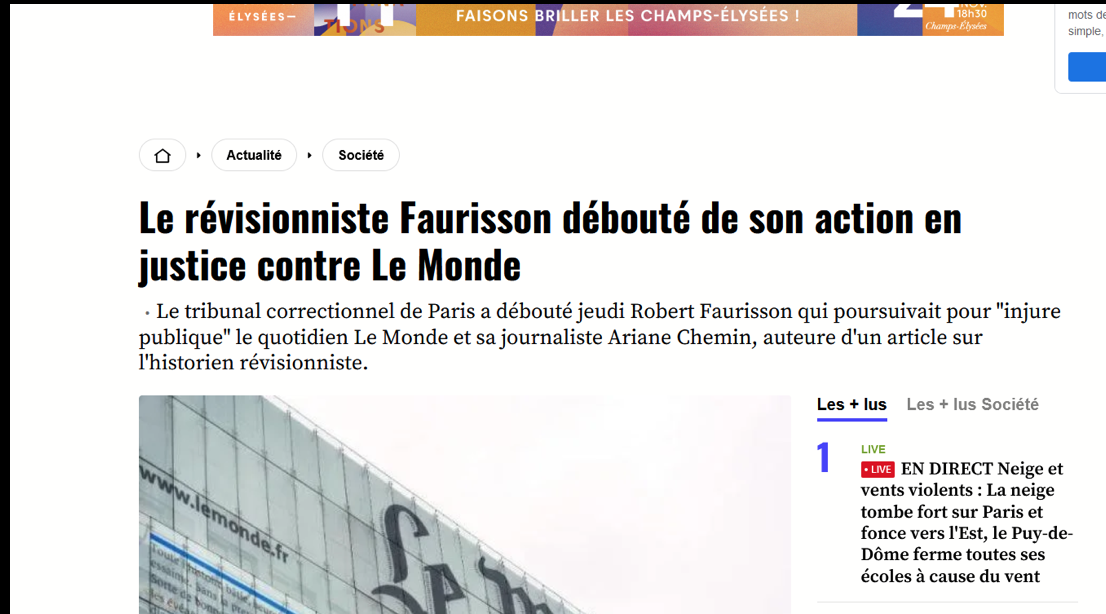 ![]() Description de la photo : AFP, 16 janvier 2014, https://web.archive.org/web/20241121134814/https:/www.20minutes.fr/societe/1274985-20140116-20140116-revisionniste-faurisson-deboute-action-justice-contre-monde |